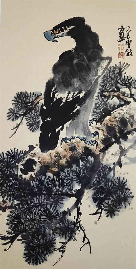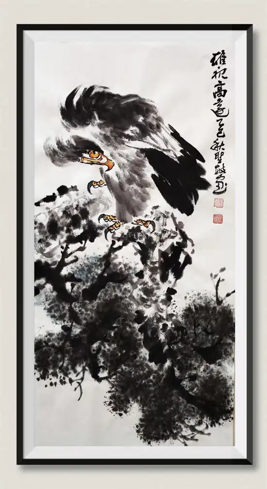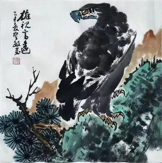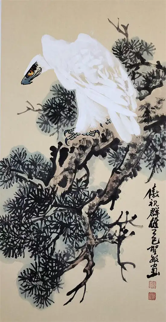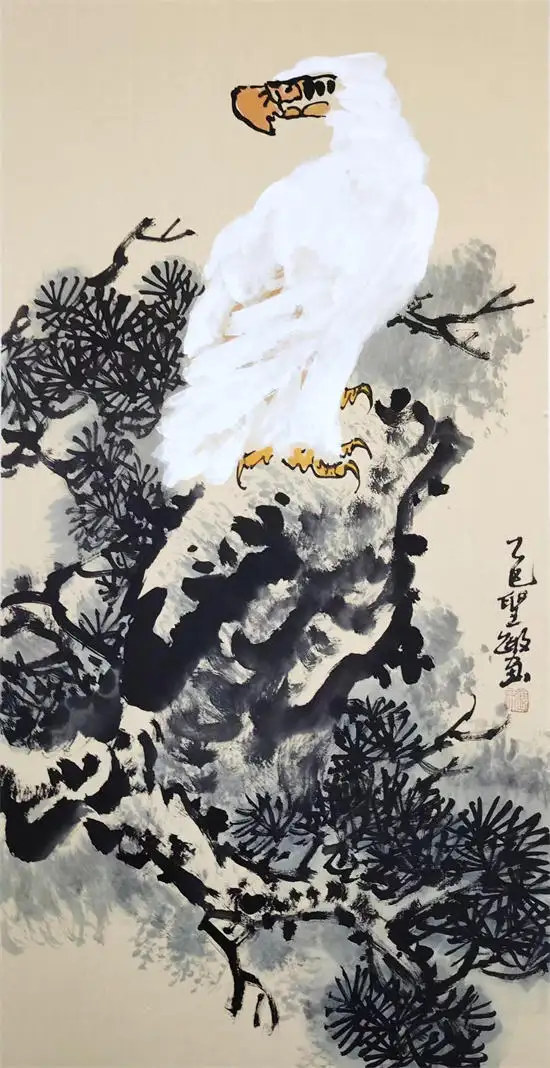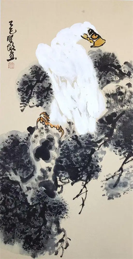 《高远图》的画面主体,是一只立于苍松枝桠间的白鹰:鹰羽以淡赭石晕染底色,再以浓墨勾出羽片纹理,既保留了工笔花鸟的细腻,又融入了写意的苍劲;背景的松针以焦墨枯笔写出,与白鹰的洁白云彩形成强烈对比,题款“高远图”三字则以行书落于左上角,笔墨苍润,与画面气韵浑然一体。
