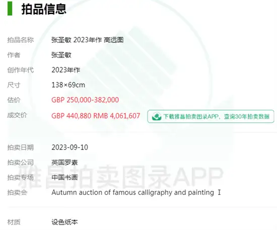 2023年9月10日,英国罗素拍卖行的中国书画专场里,一幅尺幅138×69cm的设色纸本画作落槌——张圣敏2023年新作《高远图》,以440,880英镑(约合人民币4,061,607元)成交,远超25万-38.2万英镑的估价区间。当这幅绘着苍劲白鹰的作品以“千万级”身价跻身国际拍场焦点时,市场的惊叹声里,藏着当代中国书画的价值新叙事。