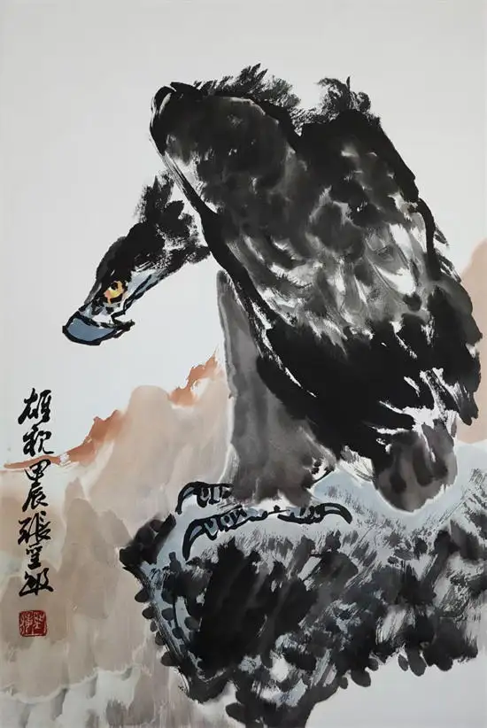 张圣敏的创作向来以“守传统而不泥古”为特点。他出身书画世家,早年浸淫于宋元花鸟的笔墨体系,尤擅鹰、鹤等题材的塑造——不同于传统鹰图常以“猛禽”凸显雄健,《高远图》中的白鹰眼神沉静,姿态舒展,松枝的虬曲与鹰身的舒展形成“动与静”的平衡,暗合“高远”所指的精神境界,而非单纯的视觉冲击。