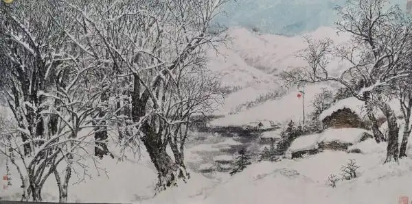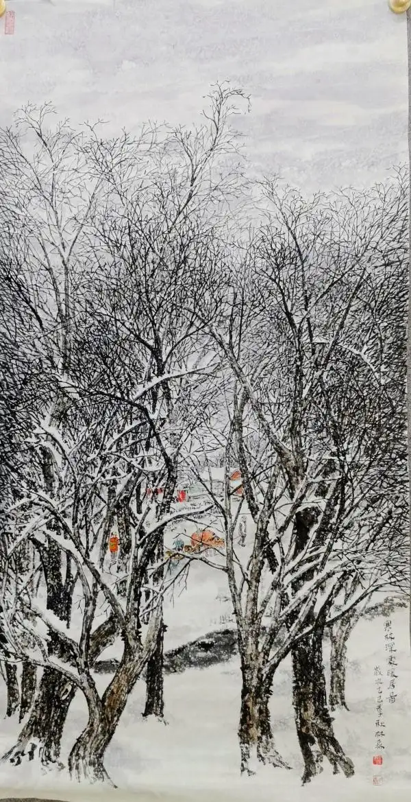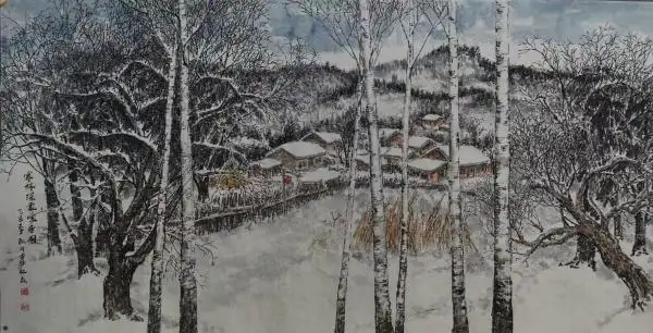 画家聚焦东北雪村寒林景致,将白桦林、雪覆山舍、牧牛雪橇等典型元素纳入画面,如《东北雪村图》中,挺拔的白桦树与红顶村落形成鲜明视觉对比,既凸显了北国雪野的荒寒旷远,又通过人物、牲畜的点缀,注入了乡土生活的温热气息,使“寒林”不再是孤冷的自然符号,而是承载着关东人文记忆的精神载体。