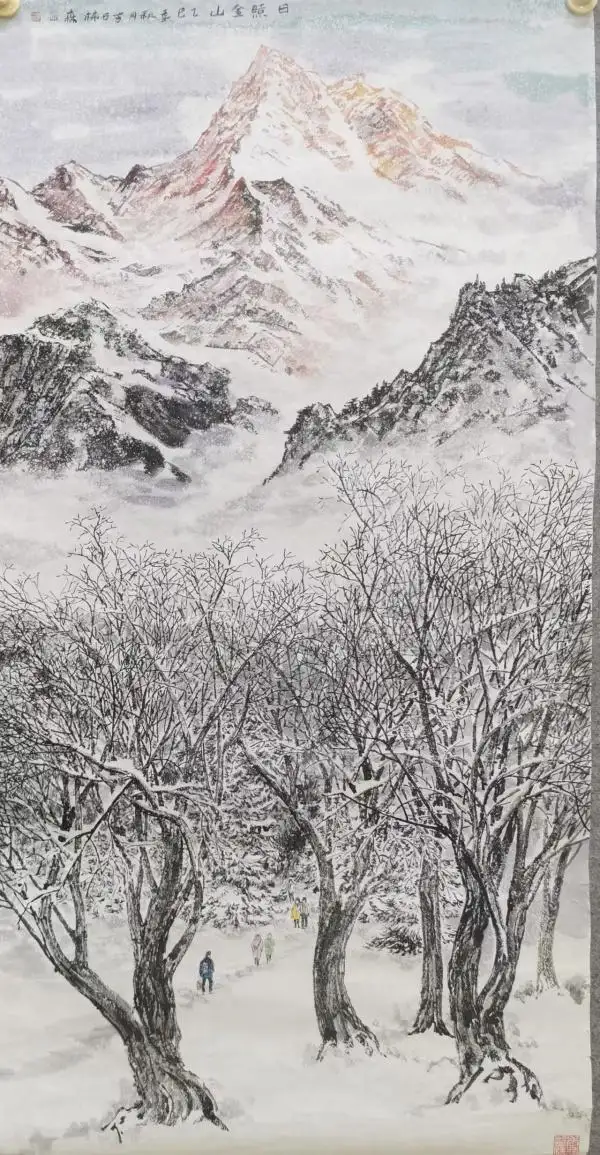 多采用深远与平远结合的构图方式,如《日照金山》以高远山势托出雪山的巍峨,又以平远寒林延伸空间,使画面兼具气势与幽寂;《雪村嬉游图》则以林间小径引导视线,将雪村的烟火气渐次展开,营造出“可游可居”的意境。整体意境在“寒”与“暖”的对冲中升华——寒在林泉雪岫的物理属性,暖在村落人文、霞光色调的精神温度,达成了“荒寒而不孤寂,冷冽而有温情”的审美意趣。