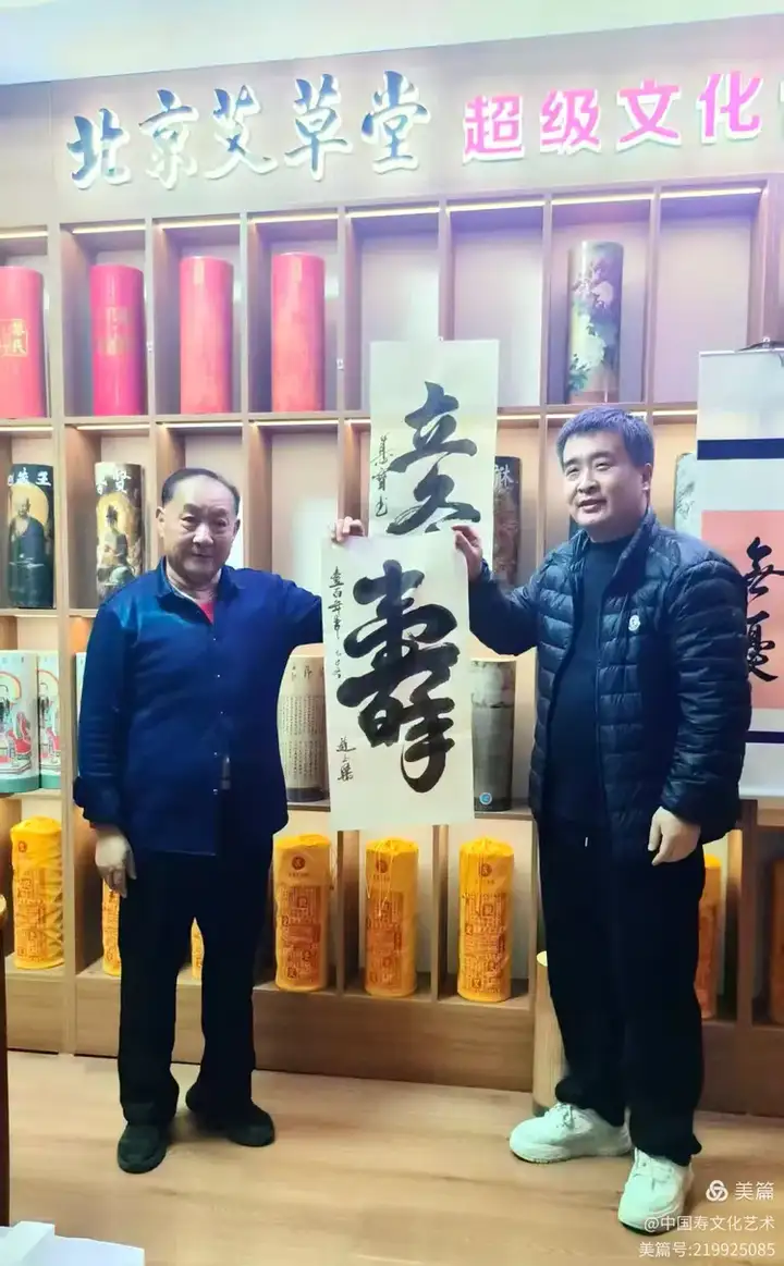 李德宝董事长从传承优秀的中华文化上认识到了寿文化书法艺术给人们身心健康带来的重要作用和美感,邀请中国书画家联谊会寿书画艺术委员会会长赵玉杰先生于2025年11月10日到位于北京市玉泉山的总部参观考查,双方并进行了友好合作的有益的探讨,达成“天地人三才合德,艾香翰墨守心宅”的共识,中国书画家联谊会寿书画艺术委员会授权北京艾草堂中医研究院使用其寿文化书法作品用于艾草堂艾条艺术品的传播和发展,共践大爱(艾)使命。